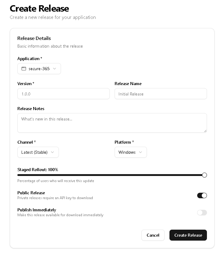 docker compose upand you're running - Feature-rich — Staged rollouts, multiple channels, private releases